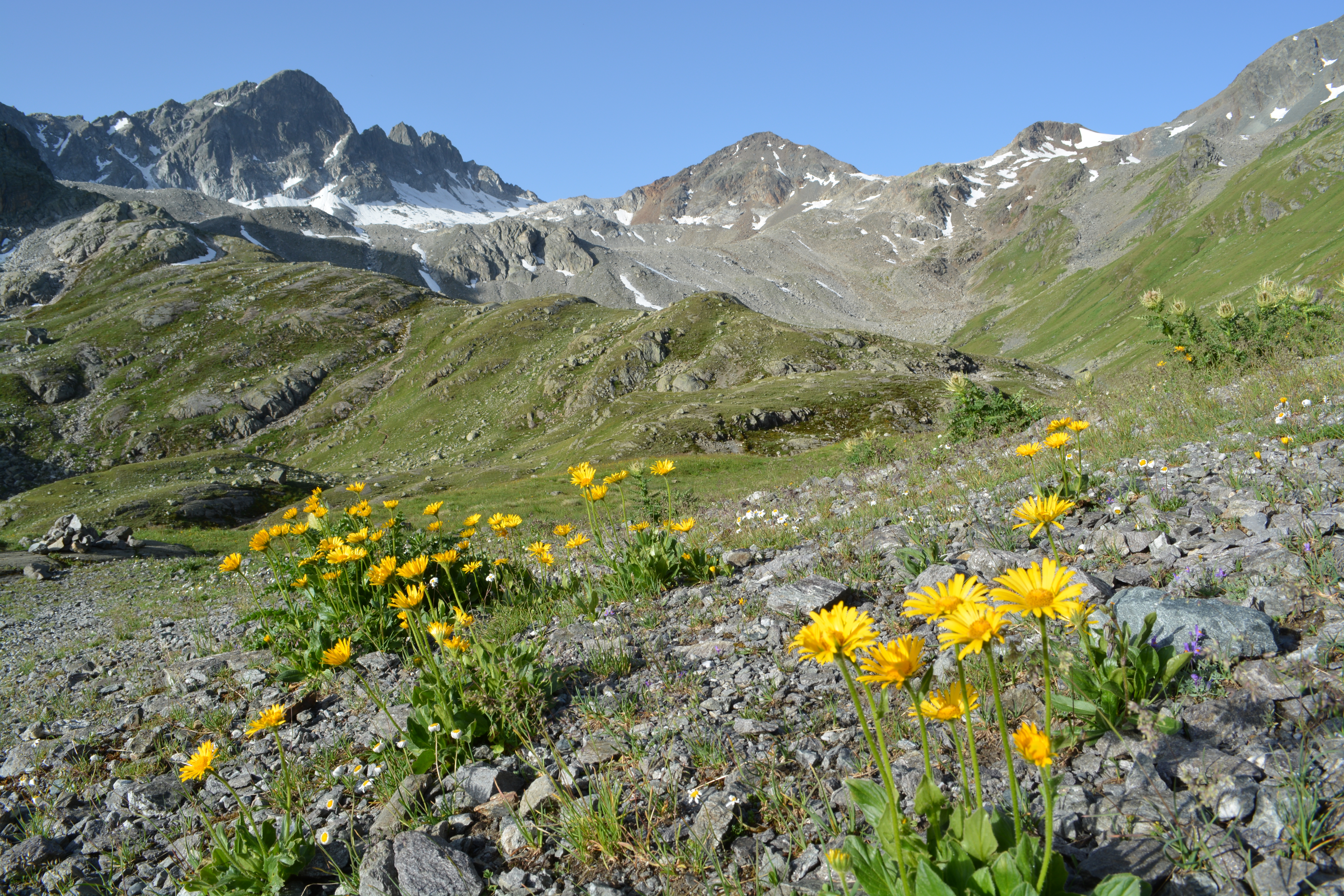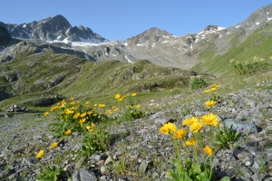 | Arnika Schwarzchopf, Flüelapassgebiet links Piz Radönt, Bildmitte Radüner Rothorn darunter der Blockgletscher Vadret da Radönt August 2013 / 14,3 MB |